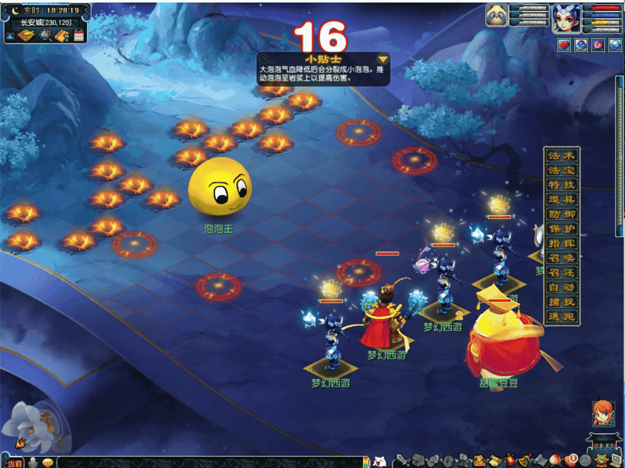 为了与豆豆们展开最终决战,本次“三界再波澜”小副本玩法和“乐园大挑战”挑战怪玩法也都会分为三个阶段。活动期间,等级不低于50级的玩家可组成5人队伍从长安城(230,120)处进入小副本进行冒险,同时也可以选择画中乐园挑战“乐园之主-泡泡王”等场景BOSS。当大家完成小副本任务后,有概率得到“松烟墨·赤金”,而在挑战怪玩法中则可获得一定数量的“勇士印章”,能够在乐园的兑奖处换取游戏物品奖励以及强大的豆豆技能。