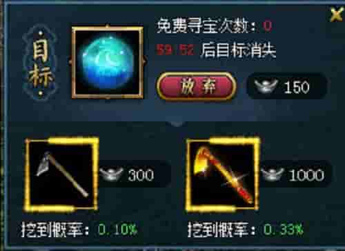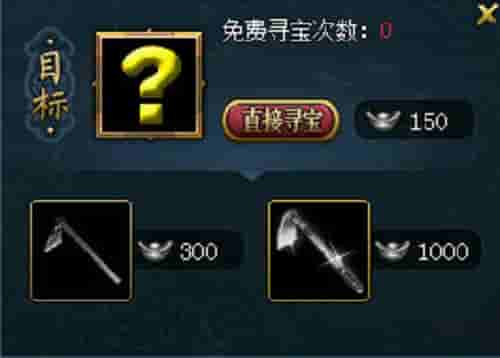通过点击“直接寻宝”按钮可以搜寻宝物,每次寻宝花费150金元宝可直接获得对应道具奖励,若未能直接获得对应道具奖励,但寻到宝物的位置,则可以使用“锄头”挖掘,直到获得奖励,玩家可使用300金元宝“锄头”挖掘一次或花费1000金元宝“锄头”挖掘一次,每日活跃值达到50,100,150还可免费获得寻宝次数哦!