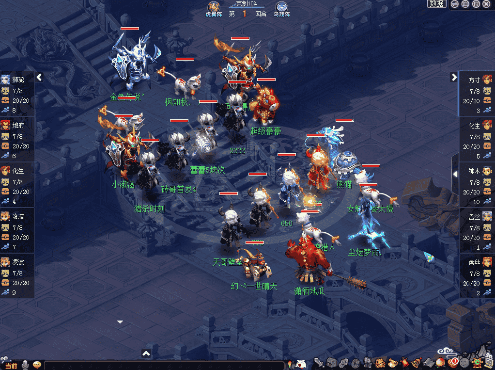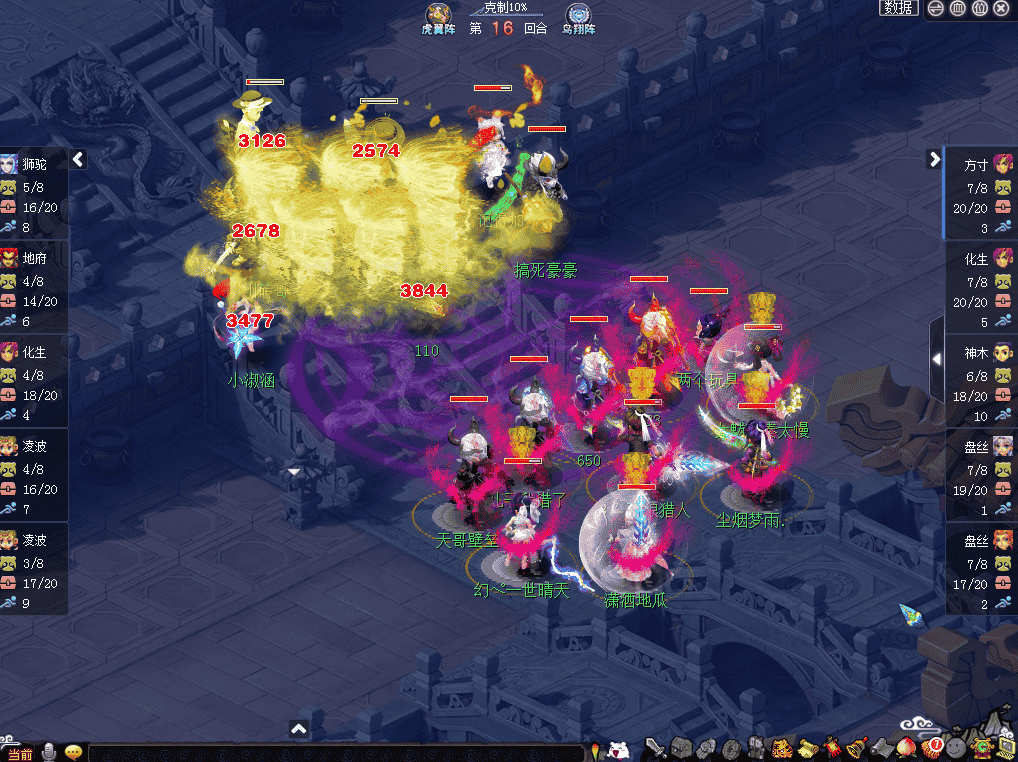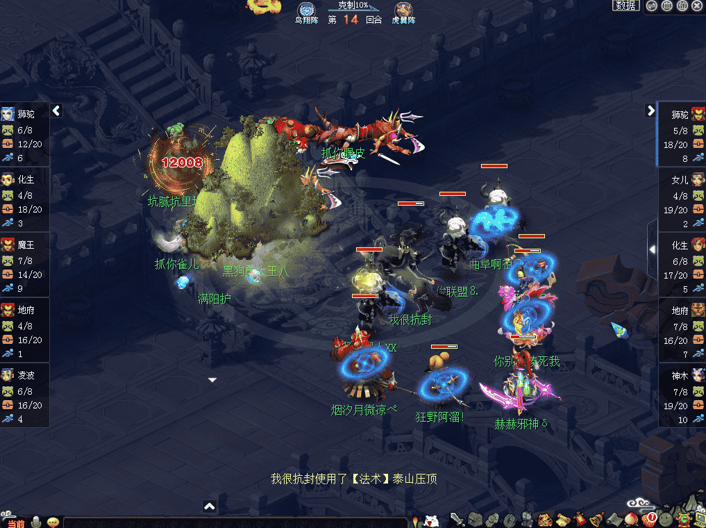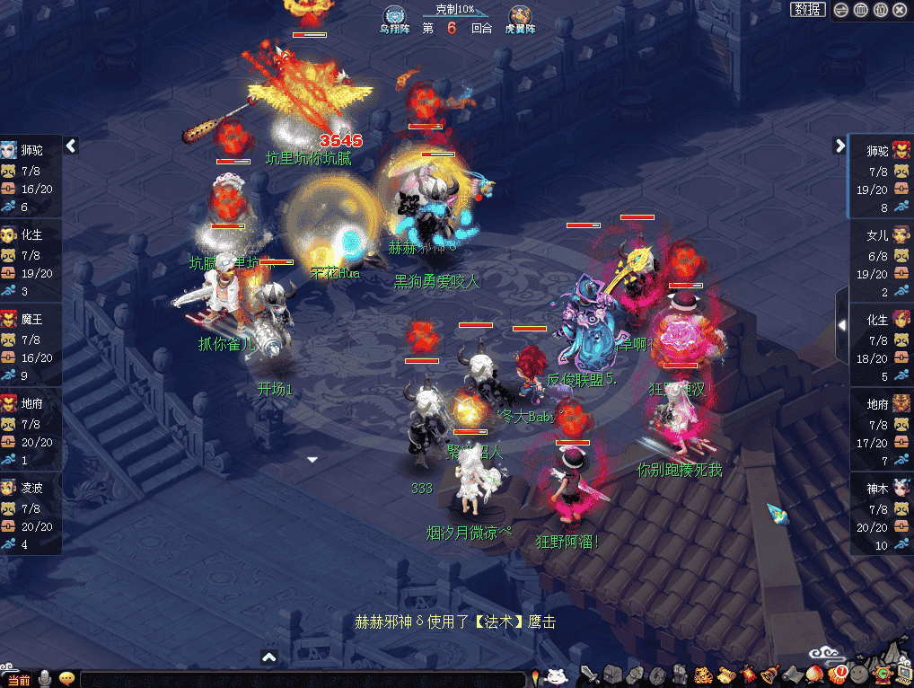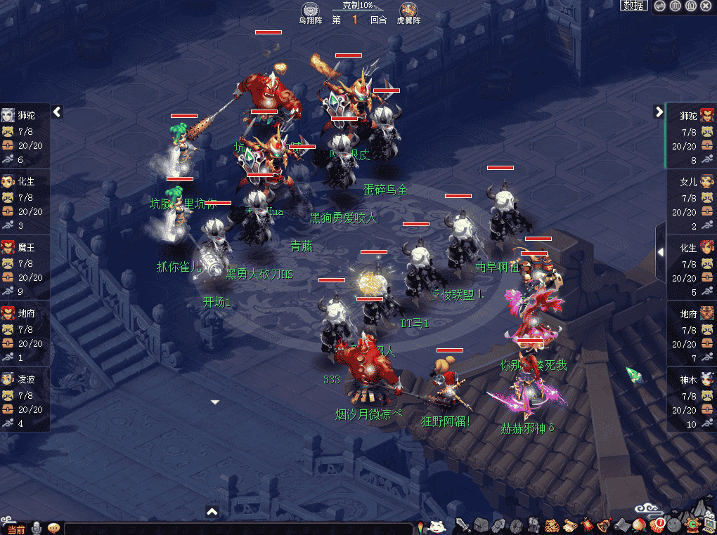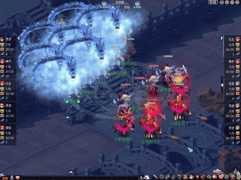 曲阜孔庙与橘子洲服务器“血色”帮派的一场战斗中,曲阜孔庙开局虎阵被对手鸟阵大克10%,并且对方地府拿到了全场1速。比赛开始后,曲阜孔庙并没有因为被大克而陷入被动,反而主动进攻,凭借己方神木林和狮驼岭的配合接连秒掉对方关键角色。
