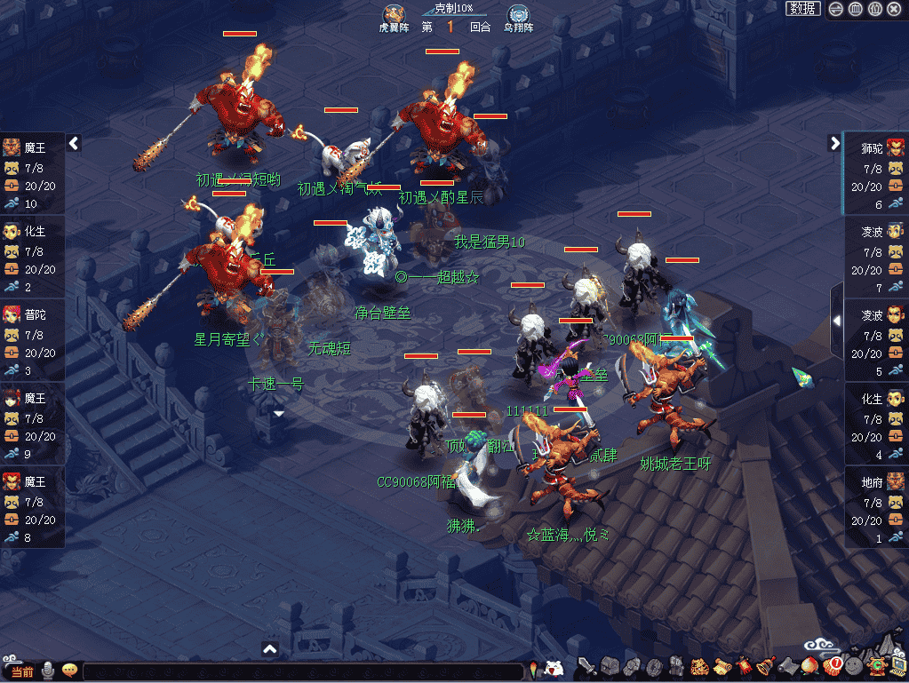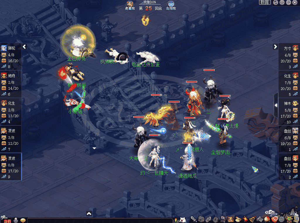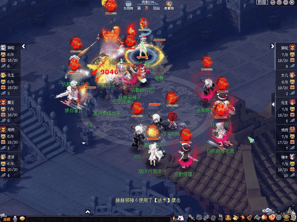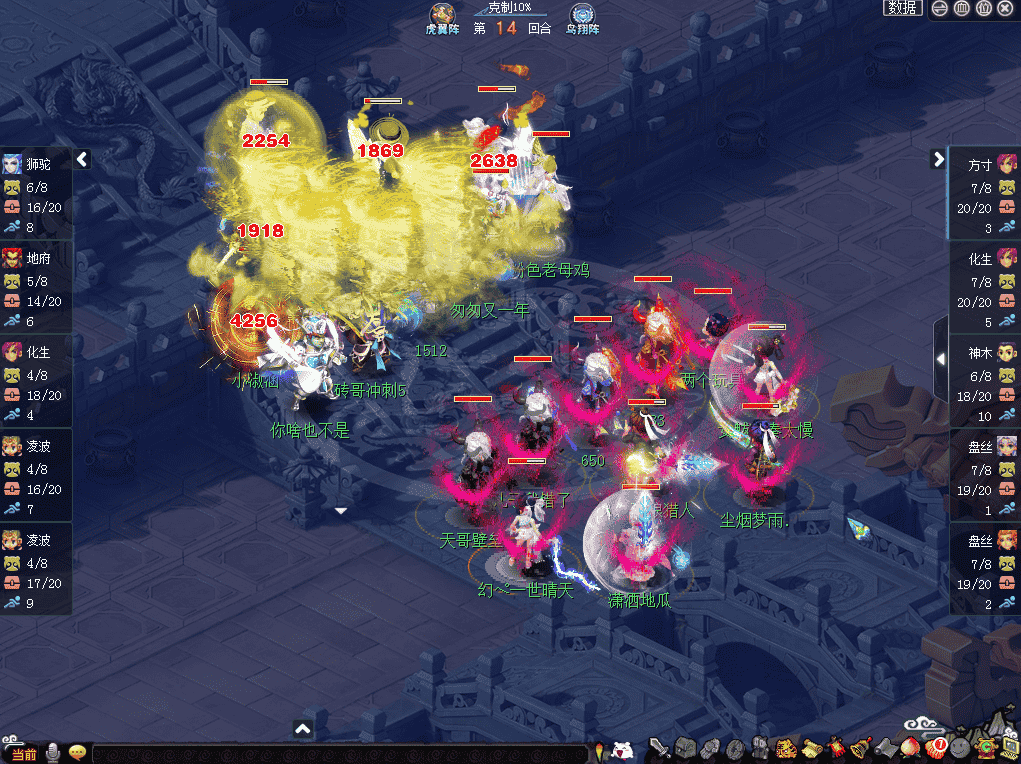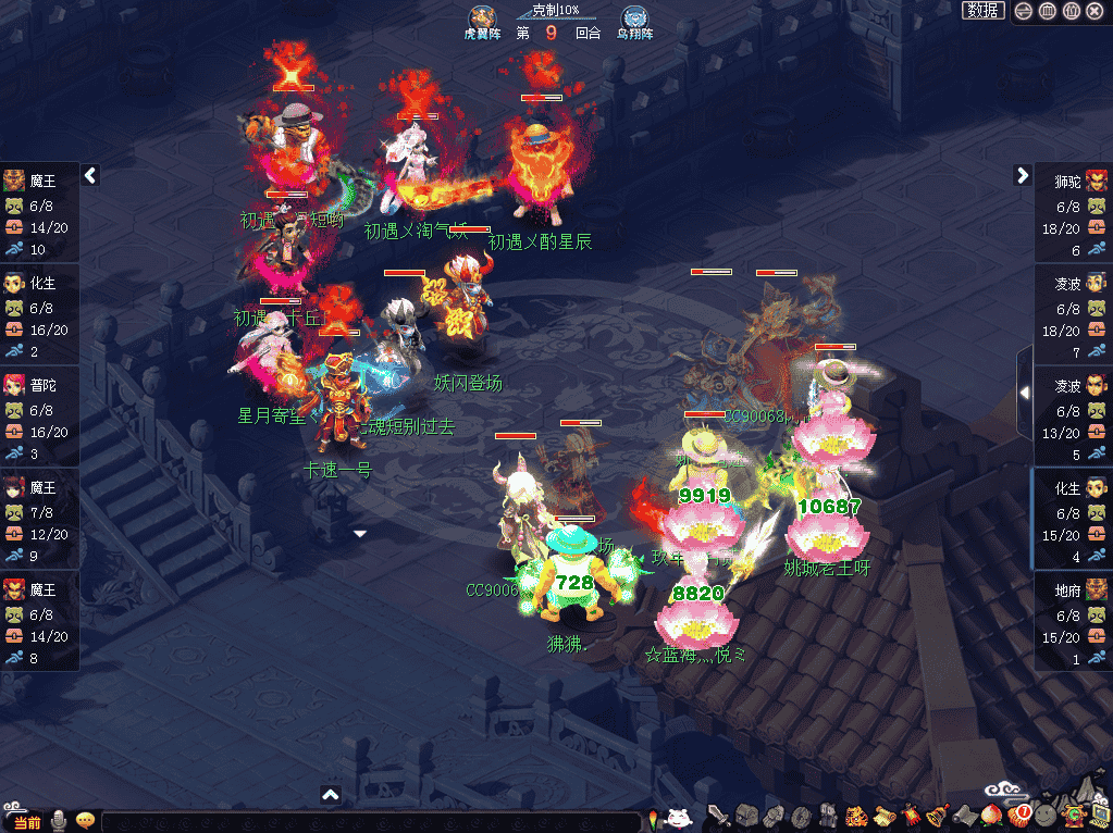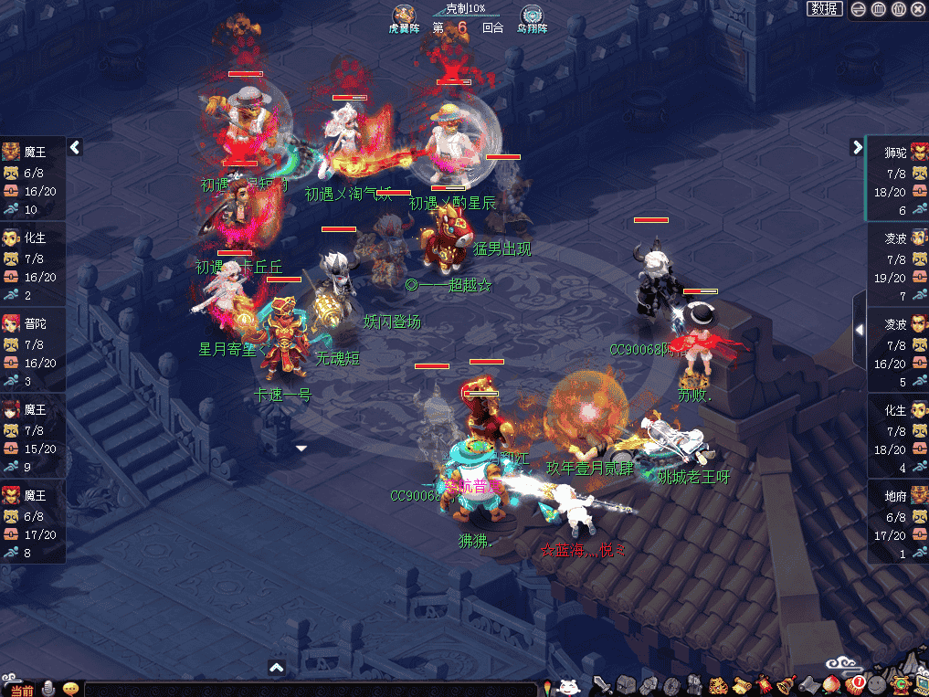 曲阜孔庙与橘子洲服务器“血色”帮派的一场战斗中,曲阜孔庙开局虎阵被对手鸟阵大克10%,并且对方地府拿到了全场1速。比赛开始后,曲阜孔庙并没有因为被大克而陷入被动,反而主动进攻,凭借己方神木林和狮驼岭的配合接连秒掉对方关键角色。