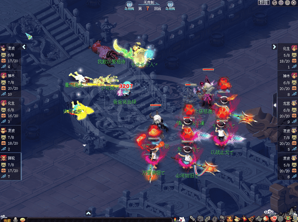 本届8强赛西栅老街与灵隐寺服务器“天山派”的一场比赛中,西栅老街开局鸟阵大克对手虎阵10%,而对方则登场三个魔王寨,直接将输出拉满。比赛开始后,灵隐寺发起猛烈进攻,第5回合直接将西栅老街两名凌波城和一名狮驼岭秒掉,剩下的地府和化生也处于残血状态。但在第6回合,西栅老街慈航普度成功,瞬间拉起所有倒地角色,化解了对方的攻势。