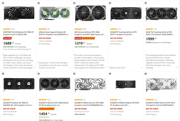 蓝宝石的RX 9070 XT、RX 7900 XT和RX 7900 XTX等显卡也位列榜单之中,尽管部分产品同样面临缺货问题,但它们的存在无疑为玩家们提供了更多的选择。而在榜单的11-20名中,我们依然能够看到RX 7600 XT、RTX 4060以及RTX 3060等老卡的身影,这些经典显卡在市场上依然保持着一定的竞争力。