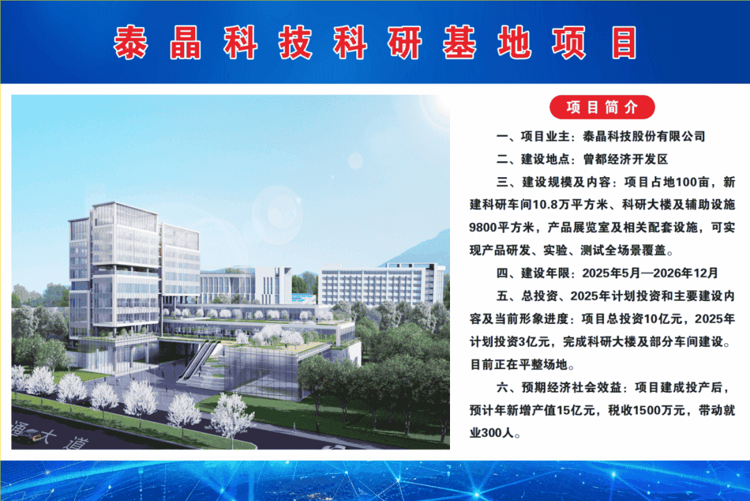 泰晶科技科研基地项目则致力于建设前沿的科创平台,吸引高端人才资源,树立企业创新驱动的新标杆。项目占地100亩,总投资10亿元,计划于2025年完成科研大楼及部分车间的建设。投产后,预计年新增产值15亿元,税收1500万元,带动300人就业。