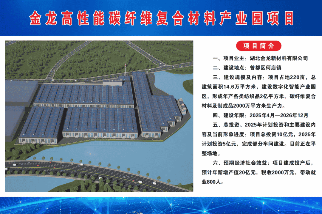 金龙集团的高性能碳纤维复合材料产业园项目同样备受瞩目。该项目占地220亩,总投资10亿元,面向全球布局,旨在壮大随州市的应急产业矩阵。预计2025年完成部分车间建设后,将新增年产值20亿元,税收2000万元,提供800个就业机会。