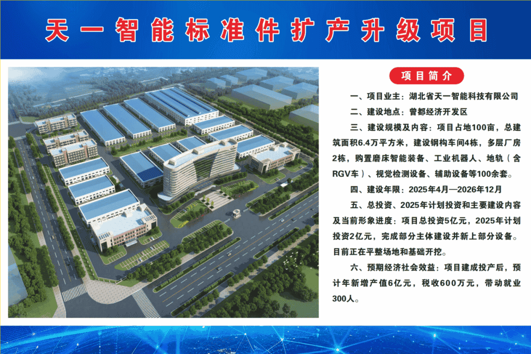 天一智能标准件扩产升级项目则是对主营业务进行产能扩张,以满足日益增长的市场需求。项目占地100亩,总投资5亿元,计划于2025年完成部分主体建设并新上设备。投产后,预计年新增产值6亿元,税收600万元,提供300个就业岗位。