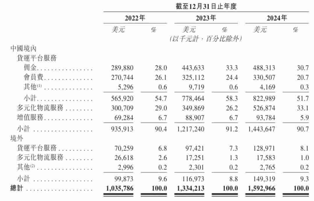 在收入构成方面,货拉拉2024年来自中国境内的收入达到了14.4亿美元。其中,货运平台服务收入占据了主导地位,达到了8.22亿美元,占比51.7%;多元化物流服务收入为5.27亿美元,占比33.1%;增值服务收入则为9378万美元,占比5.9%。公司来自境外市场的收入也达到了1.49亿美元,占总收入的9.3%。