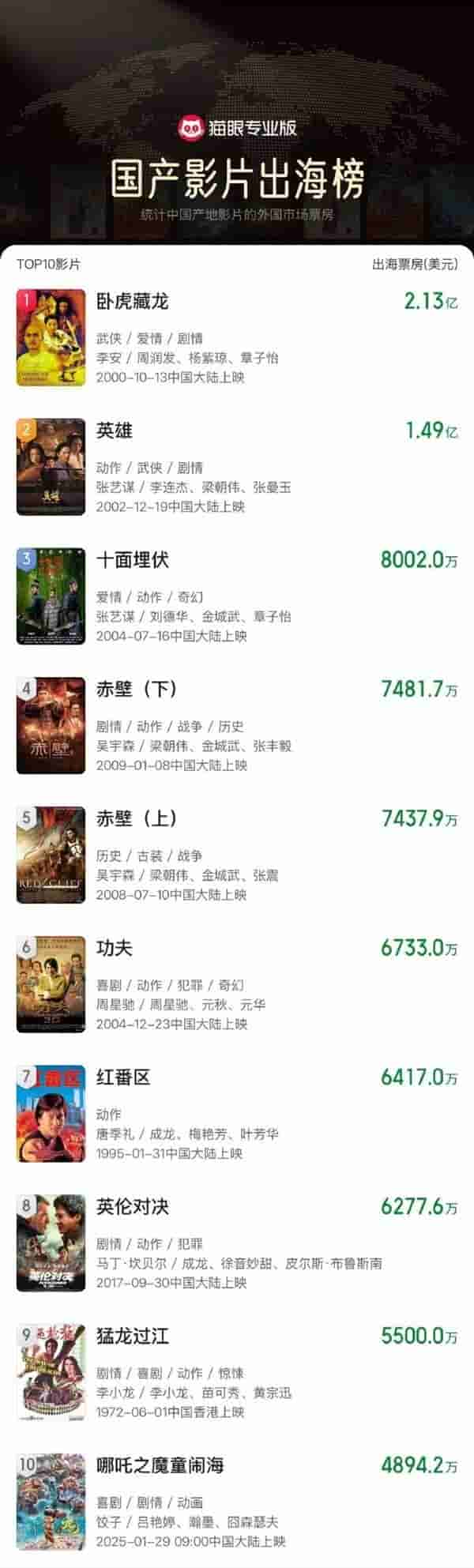 近期,国产动画电影《哪吒之魔童闹海》(简称《哪吒2》)在国际影坛上大放异彩,其海外票房成绩已正式跨越4894.2万美元大关,这一成就使其成功跻身国产电影海外票房排行榜的前十强。与此同时,该片的全球总票房更是突破了惊人的155亿元人民币,稳居全球影史票房榜的前五名,与排名第四的经典影片《泰坦尼克号》之间的差距已缩小至不足10亿元人民币。
