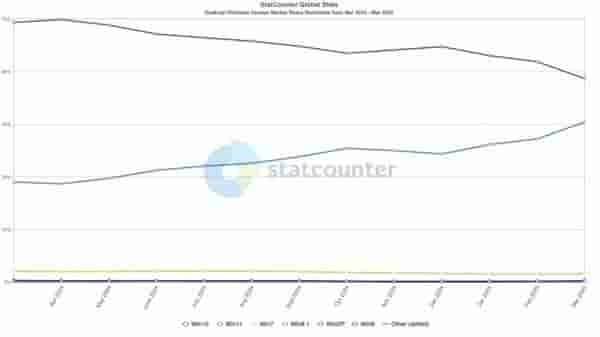 据Statcounter的统计,截至2025年3月底,Windows 10在全球Windows PC中的占比已降至54.23%,与前一个月相比,下滑了4.43个百分点。这一数据无疑为Windows 10的未来蒙上了一层阴影。