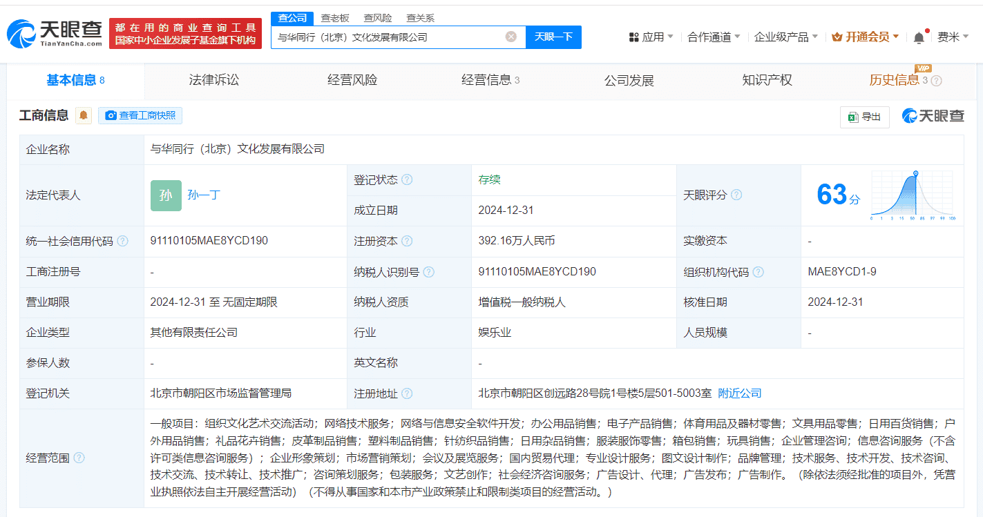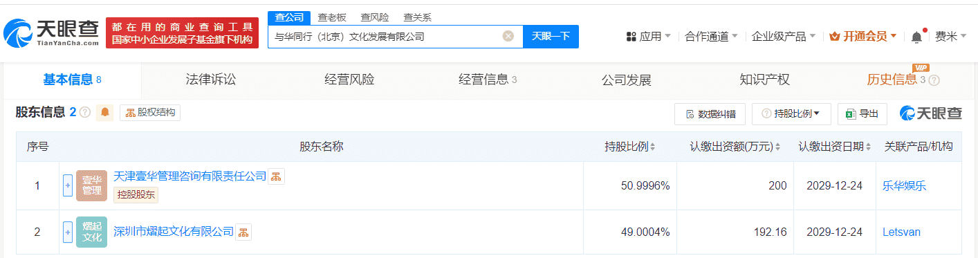 进一步挖掘发现,深圳市熠起文化有限公司在对外投资方面也有所布局,它持有与华同行(北京)文化发展有限公司约49%的股权。而乐华娱乐旗下的天津壹华管理咨询有限责任公司,则持有与华同行(北京)文化发展有限公司剩余的51%股权,两家公司在资本层面存在紧密的合作关系。