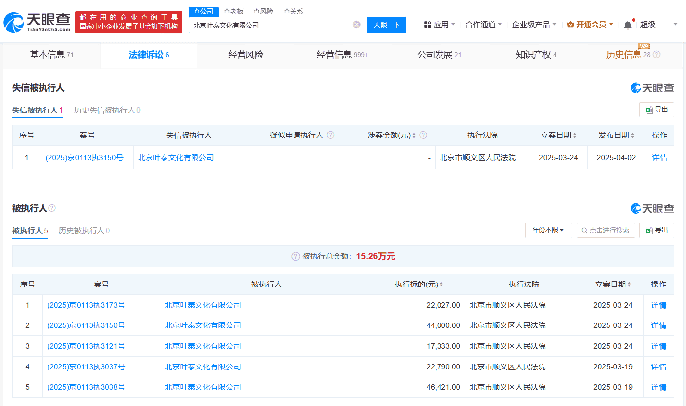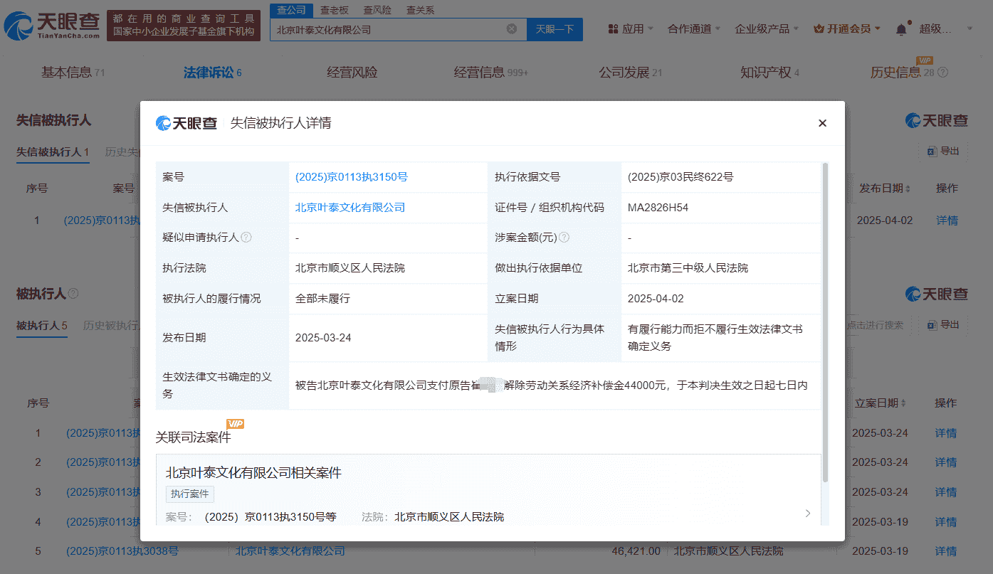 据天眼查信息显示,该案件的执行流程已经启动,并且北京叶泰文化有限公司已因此案被强制执行了4.4万元。这一事件再次将公众的注意力引向了该公司的经营状况和法律责任。