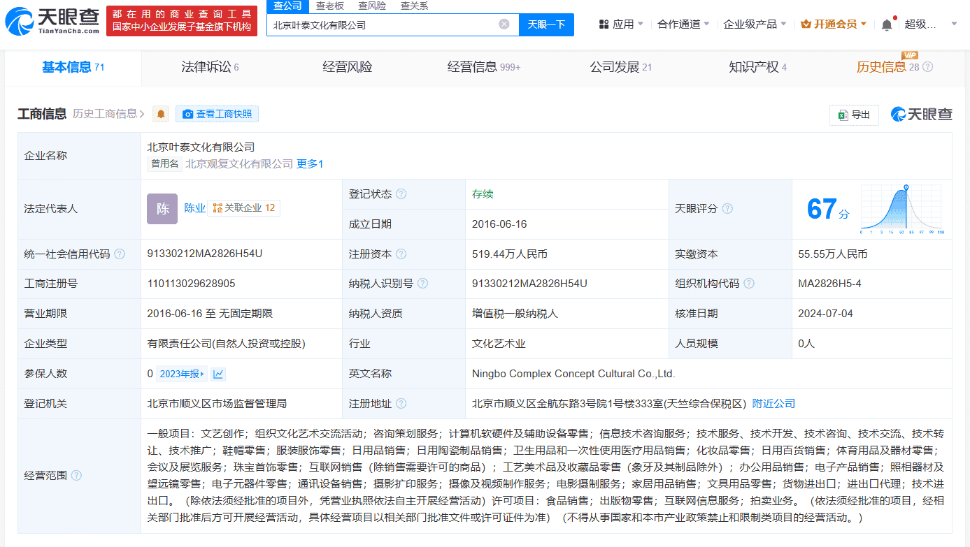 北京叶泰文化有限公司成立于2016年6月,法定代表人为陈业,注册资本为519.44万元人民币。公司目前的股权结构由陈业和尹帆共同持有。值得注意的是,2024年7月,知名人士马未都等人已从该公司的股东名单中退出。这一变动是否与公司当前的法律纠纷有关,目前尚不得而知。