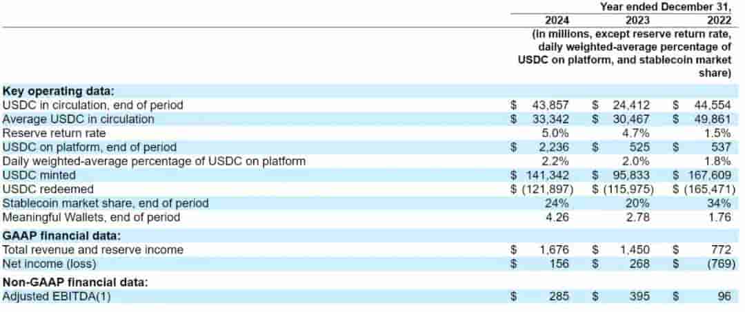 从财务表现来看,Circle的招股书揭示了其稳健的增长态势。2022年至2024年间,公司的营收从7.72亿美元增长至16.76亿美元,运营利润也从亏损3812万美元转为盈利2.69亿美元和1.67亿美元。