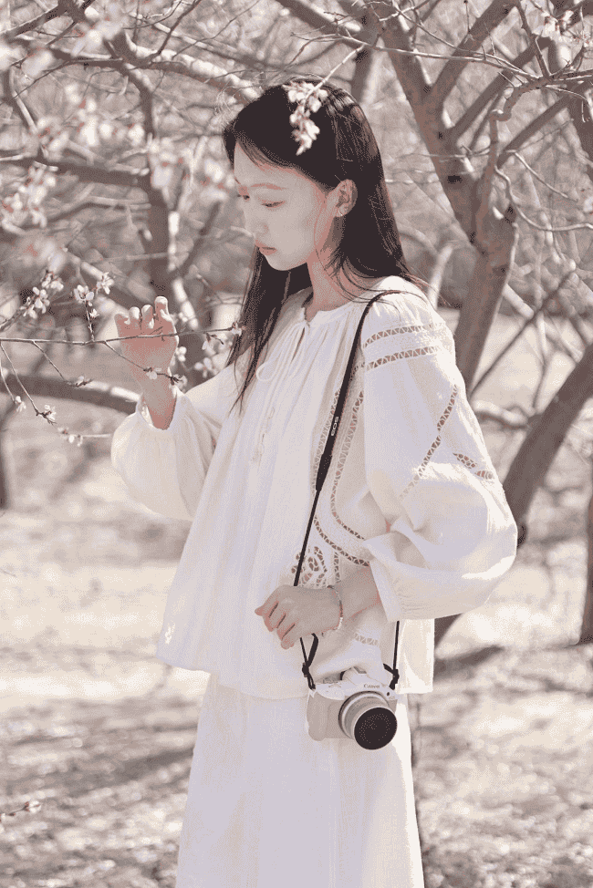 在拍摄技巧上,她强调了用光的重要性。尽管桃花下的人像看似简单,但实际上,光线的运用对照片效果有着至关重要的影响。在没有专业打光设备的情况下,她巧妙地利用相机顶部的闪光灯,减弱了模特面部的阴影,提亮肤色,带来了意想不到的效果。