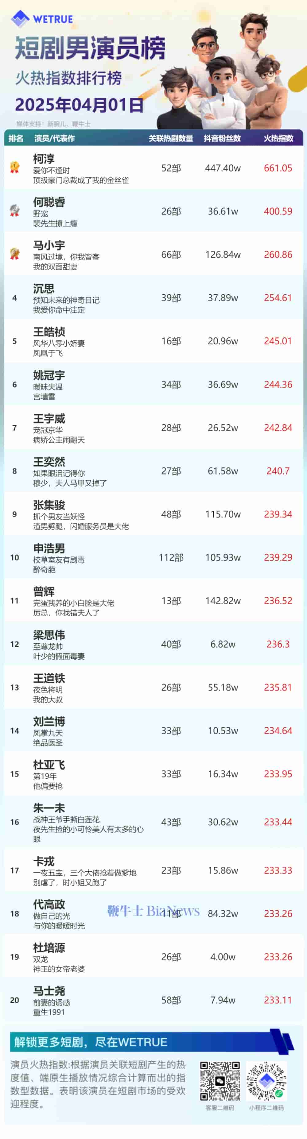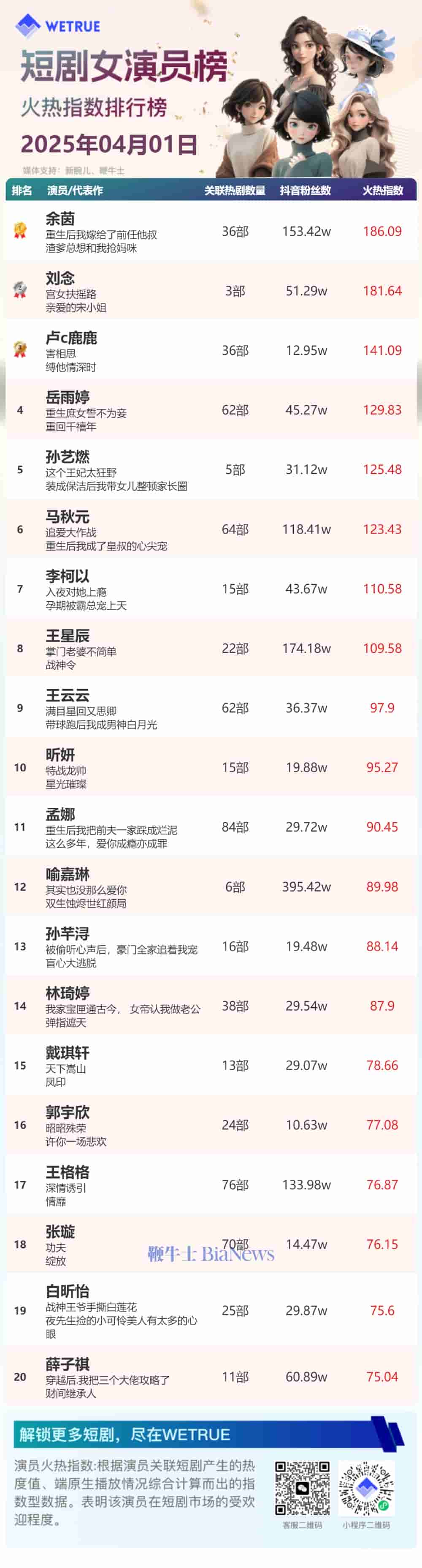 4月1日短剧演员火热指数出炉:余茵、柯淳登顶冠军宝座