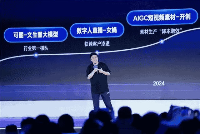 快手高级副总裁王剑伟站在台上,背后大屏跳动着724亿这个数字——这是快手2024年线上营销服务的总收入,同比增长20.1%。他语气笃定:“AI不是选择题,而是商业经营的必答题。”