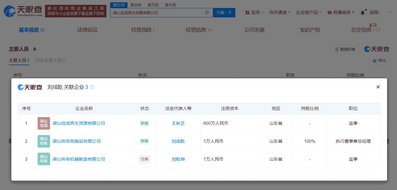 尤为值得注意的是,梁山佳成再生资源有限公司与近期卷入质量风波的梁山希希纸制品有限公司存在关联。今年的3·15晚会曝光了梁山希希纸制品有限公司销售劣质卫生巾和婴儿纸尿裤的问题,引起了广泛关注。天眼查进一步揭示,梁山希希纸制品有限公司的法定代表人、执行董事兼总经理刘成乾,同时也是梁山佳成再生资源有限公司的监事。