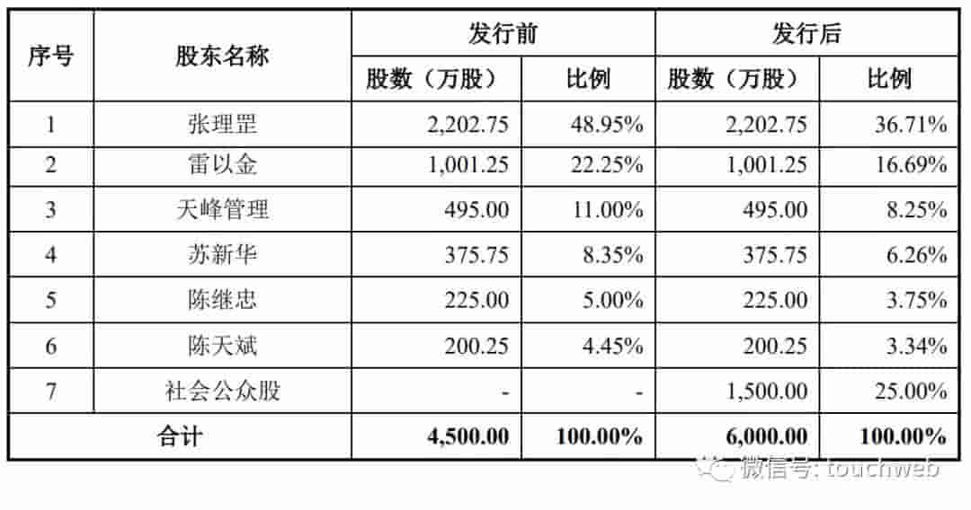 IPO前公司的其他重要股东包括持有22.25%股权的雷以金、持有11%股权的天峰管理、持有8.35%股权的苏新华等。IPO完成后,公司的股权结构将发生一定变化,但张理罡仍将是公司的最大股东和实际控制人。