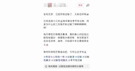 近期,季节性过敏成为了众多民众健康的一大困扰。在社交媒体平台上,一名用户倾诉了自己的长期过敏经历,表示尽管每年都遭遇季节性过敏,但今年的过敏症状却提前至三月爆发,每日喷嚏连连、鼻涕不止,尤其过敏性结膜炎带来的眼部瘙痒更是苦不堪言,即便足不出户也难以缓解,令人倍感折磨,且过敏持续时长如同开盲盒般难以预测,今年更是较往年提前许多。