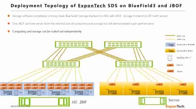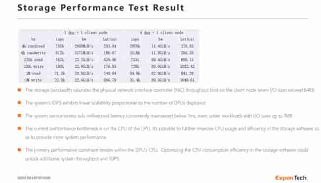 方案的实测部署架构展现了其强大的扩展性和灵活性。存储服务器(JBOF)配备4块NVIDIA BlueField3 DPU,提供1600Gbps网络带宽,并通过24块ScaleFlux CSD5000 NVMe SSD实现高效存储。计算服务器则作为另一核心组件,同样配备4块BlueField3 DPU,提供800Gbps网络带宽,并运行ExponTech WADP存储软件的存储网关和协议。计算服务器上可配置GPU用于训练或推理,而存储软件和网络流量则在DPU内运行,从而释放了计算服务器的CPU和内存资源,使其能够专注于计算任务。