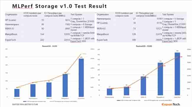 方案还通过了MLPerf Storage v1.0基准测试,这是国际AI性能基准评测中针对AI Storage的测试。在ResNet50模型下,该方案在单客户端节点上实现了超越所有参与正式测试厂商的性能表现,单客户端能够支持的GPU卡数量和存储带宽均位居前列。这一测试结果进一步证明了ExponTech新型AI存储方案的全球领先地位。