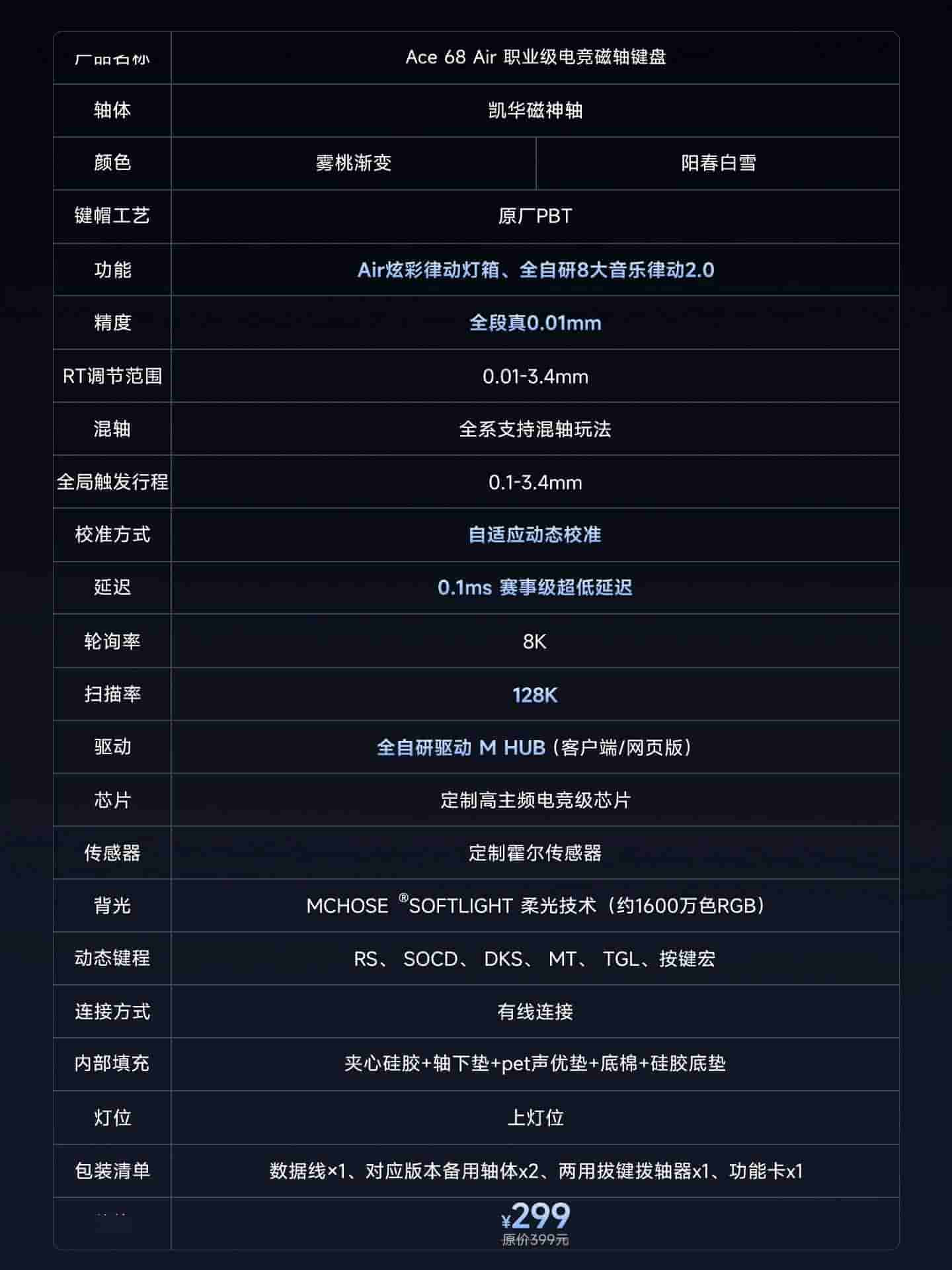 作为迈从公司的最新力作,Ace 68 Air磁轴有线机械键盘在外观设计、核心部件、内部结构以及灯光效果等方面均表现出色,无疑将成为机械键盘市场中的一款热门产品。目前,该键盘已正式上市,首发售价为299元,感兴趣的用户不妨关注一下。