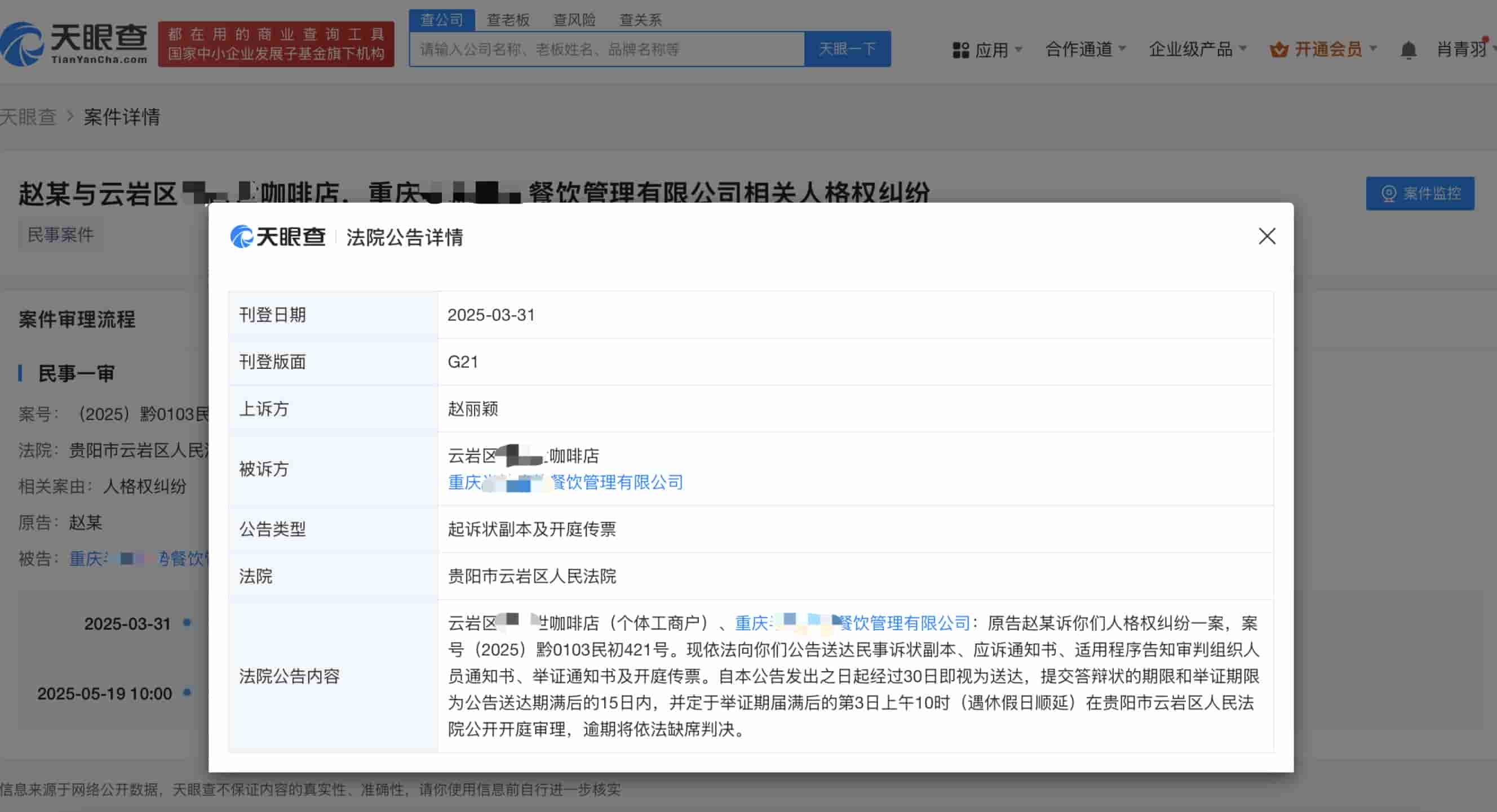 近日,一场备受瞩目的法律纠纷案件有了新的进展。据天眼查信息显示,贵阳市云岩区人民法院已正式向重庆某餐饮管理有限公司及云岩区内的一家咖啡店发出了公告,内容关于知名演员赵丽颖与这两家公司之间的人格权纠纷。