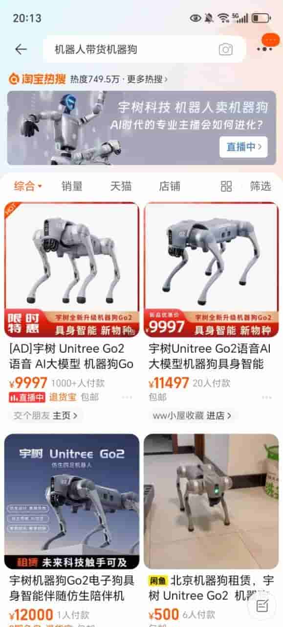 当晚,这场迅速引发了广泛关注,“宇树科技 机器人带货机器狗”的话题迅速攀上淘宝热搜榜,从一个社会热点迅速演变为引领购物潮流的新趋势。