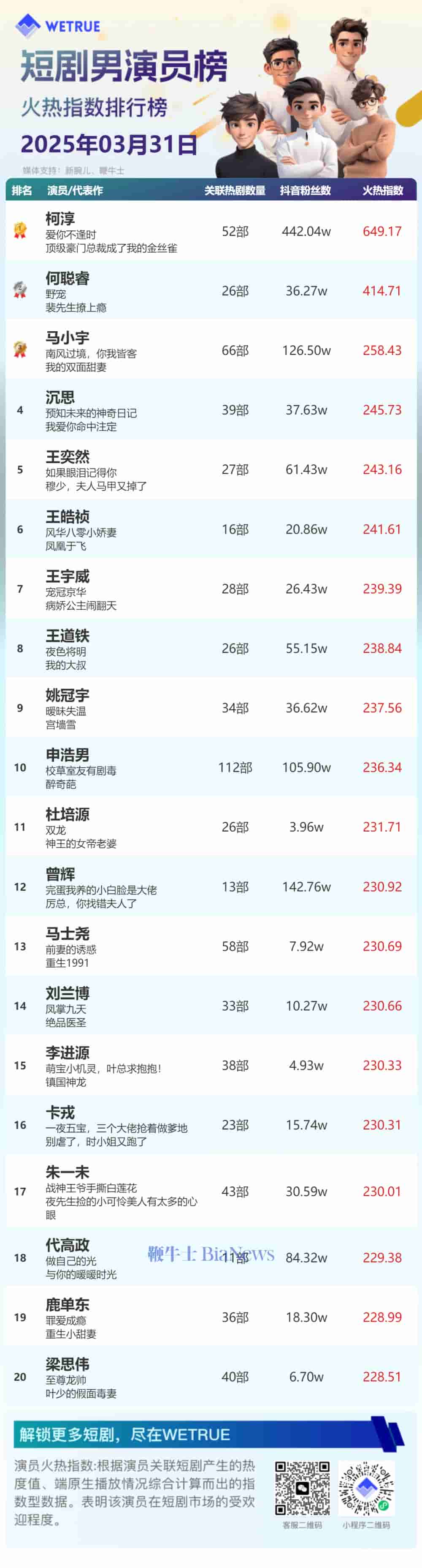 3月31日短剧演员火热榜出炉:余茵、柯淳登顶男女演员榜!