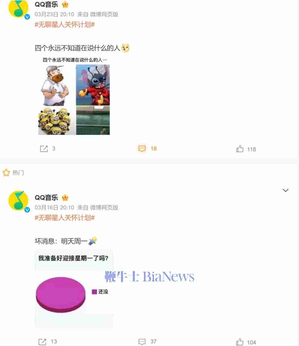 与此同时,一些网友还翻出了QQ音乐每日晚8点左右发布的#无聊星人关怀计划#相关微博,认为这些内容与此次事件形成了鲜明对比。在粉丝焦急等待专辑发货的时候,QQ音乐却发布了一些看似与主题无关的有趣内容,这无疑加剧了粉丝的不满情绪。