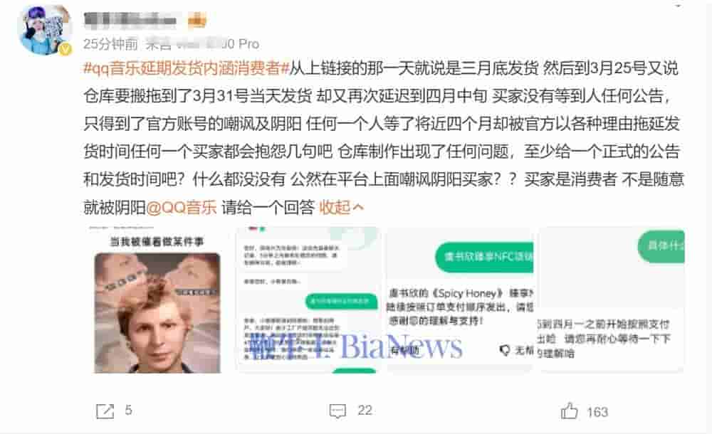近日,网络上掀起了一场关于QQ音乐与消费者互动的风波。事件的起因是女星虞书欣的专辑发货时间有所调整,原定3月31日陆续发货,却突然改为4月中下旬,这一变动引发了众多网友的关注和询问。