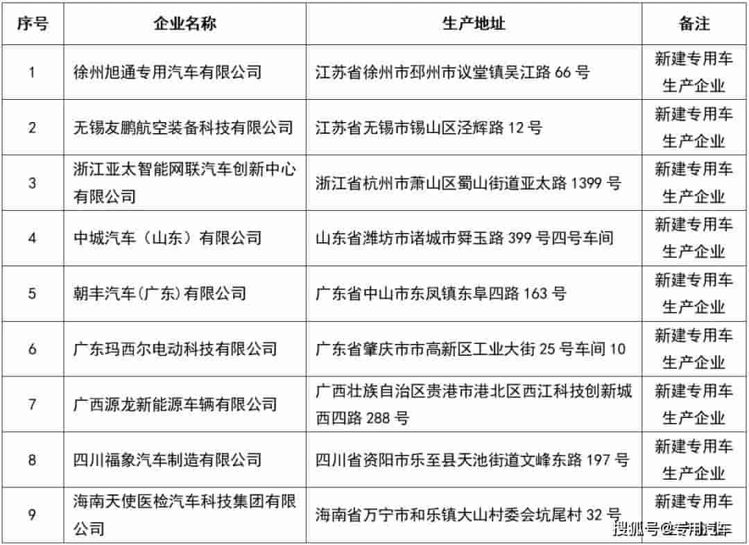 具体来看,新增的企业名单及其生产地址已经公布。这些企业分布在不同的城市和地区,各具特色,将为我国的专用车市场注入新的活力和竞争力。