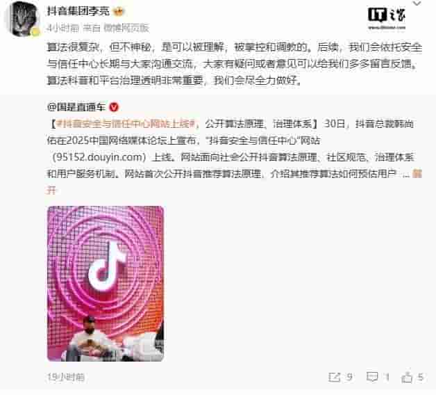 紧随其后,抖音副总裁李亮通过微博发表见解:“算法虽复杂,却非神秘之物。它能够被理解、掌控乃至优化。未来,抖音安全与信任中心将成为我们与用户沟通的桥梁,诚邀大家留言反馈,共筑算法科普与平台治理的透明之路。我们深知,这责任重大,抖音定当全力以赴。”