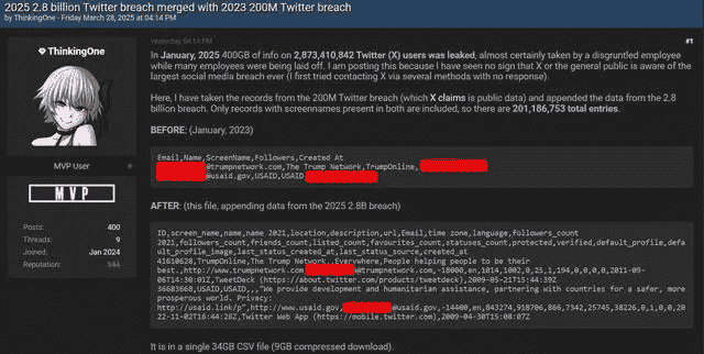 近期,国际数据泄露领域传来一则震撼消息。据海外知名安全资讯平台HACKREAD的报道,数据泄露论坛Breach Forums上的知名用户ThinkingOne于近日披露,某知名社交平台X在今年1月遭遇了前所未有的数据安全危机。据悉,该平台高达400GB的数据遭到泄露,其中包含了惊人的28亿7341万842条账户个人信息。