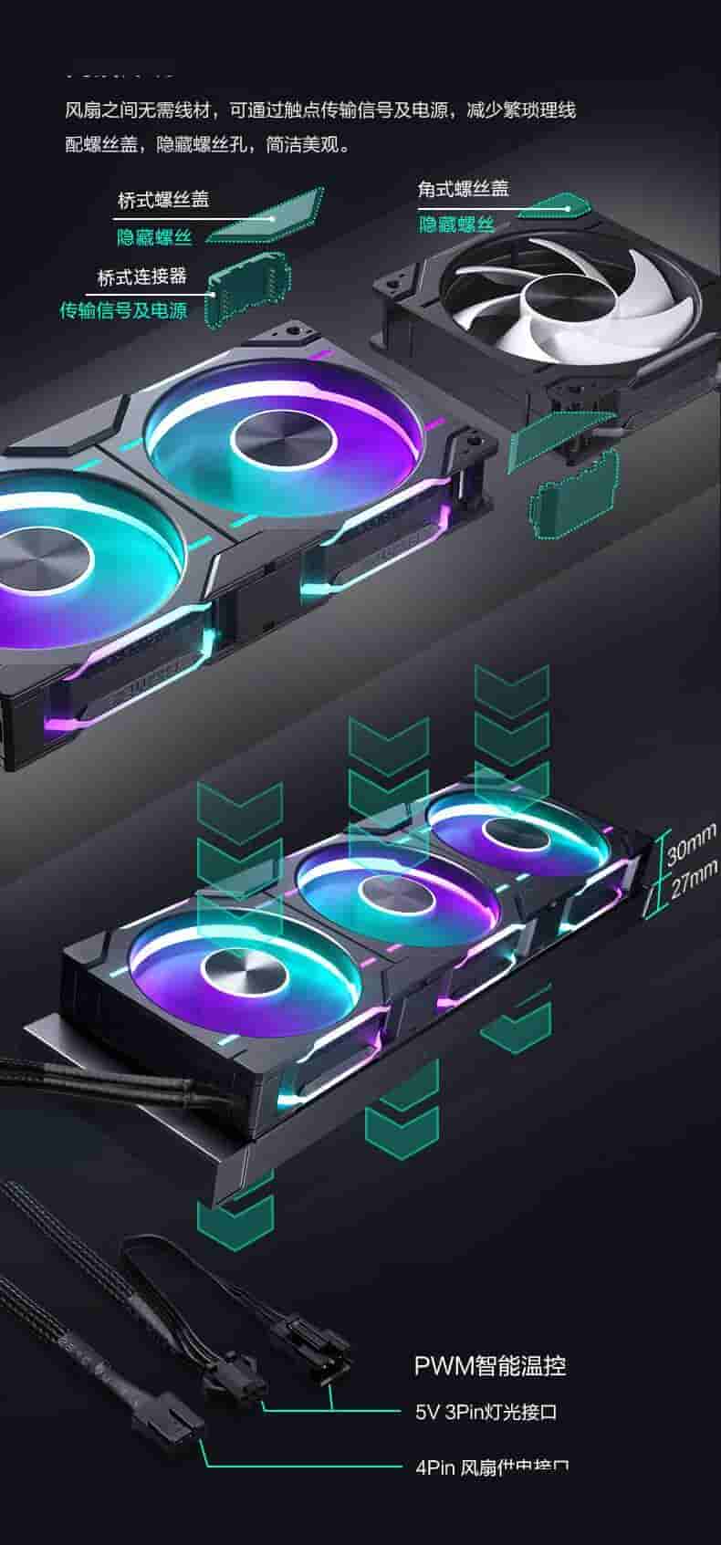 在排风扇方面,Glacier One 360 D30 X2选用了三颗D30-120 ARGB风扇。这些风扇采用30mm加厚扇体和FDB液压轴承设计,支持积木拼接,不仅正面有光效区,侧面也配备了灯带。风扇的转速范围在250~3000 RPM之间,最大风量可达64.3 CFM,最大风压为3.01 mmH2O,最大噪声控制在30.2 dB(A)以内。