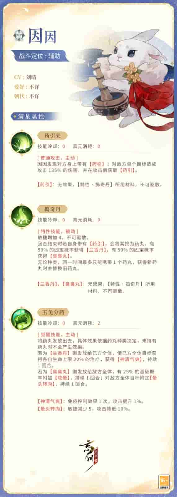 因因在战斗中作为辅助出战!它以技能【药引来】为普通攻击,【捣奇丹】为特性技能,【玉兔分药】为觉醒技能,因因捣药,神清气爽!