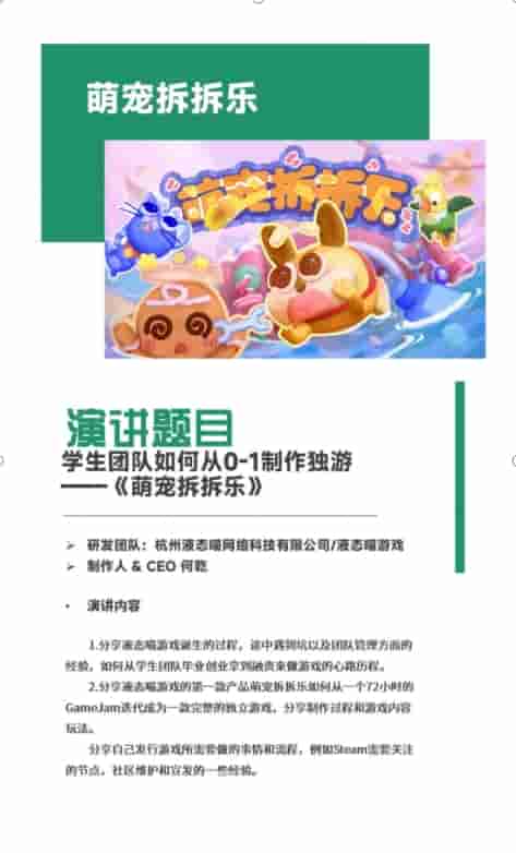 具,市场/商务/社区运营等不同角度,分享和探讨游戏开发技术成果,打造全球游戏开发者相互交流、学习、合作的平