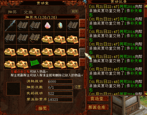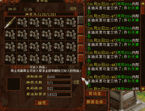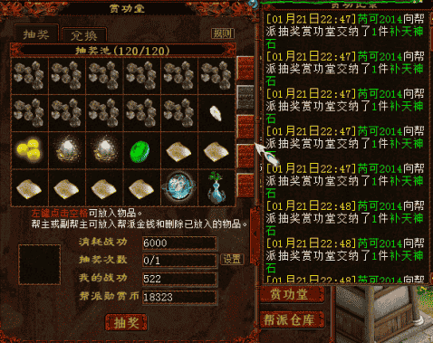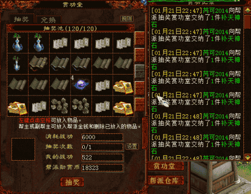 我们帮派还会组织一些的活动增进大家的感情,也会有一些特别的奖励,比如本周赏功堂,放了一些超级露露,谁抽到了,我线下邮寄王老吉给他,新的一年,我希望红红火火的王老吉能够让兄弟们鸿运当头!