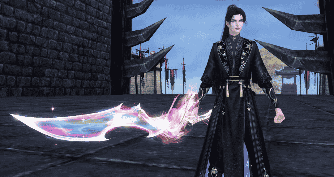 全身透亮的单刀仿佛是由一整块水晶雕琢而成,刀身中不断流淌着七彩的光芒,好似一条梦幻的长河被锁在其中,刀柄处却无比纯净,在饰物的映衬下透出一丝浅金色的光芒,倒有一丝低调奢华。锋锐无比的单刀未免过于凌厉,好在有护手处柔软的凤羽做点睛之笔,让整把武器刚柔相济。包裹在凤羽之上的暖色调光焰,为冰冷的水晶剑身补充了些许温暖,而焰心中不断散发出的点点星光则覆盖了整把单刀,让其变得精美异常。
