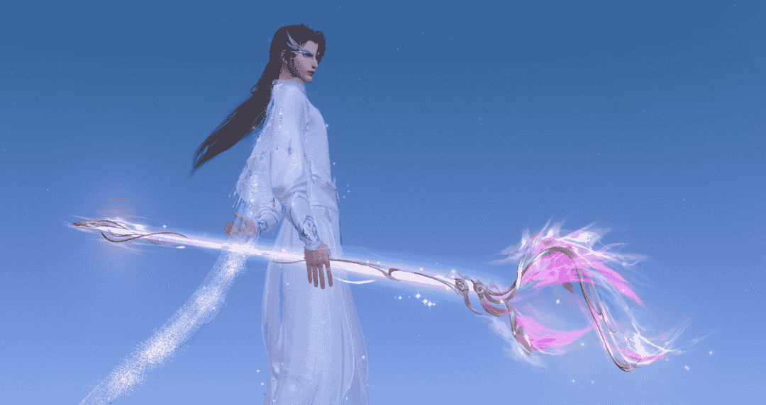 一根通体散发耀眼白光的杖子构成了红鸾照影杖的主体,相传它是由水晶打造,吸收了日精月华才能释放出如此的光芒。水晶杖身之上是一路蜿蜒的鎏金装饰,在杖首处分流、汇聚,加上几处简单点缀的赤红尾羽,好似一团火苗包裹着正浴火重生的凤凰。在整根法杖周身环绕流转的光焰让整把武器更显灵动,杖首的火苗也栩栩如生,杖身上不是飘落的点点星光又增添了几分如梦似幻的感觉。