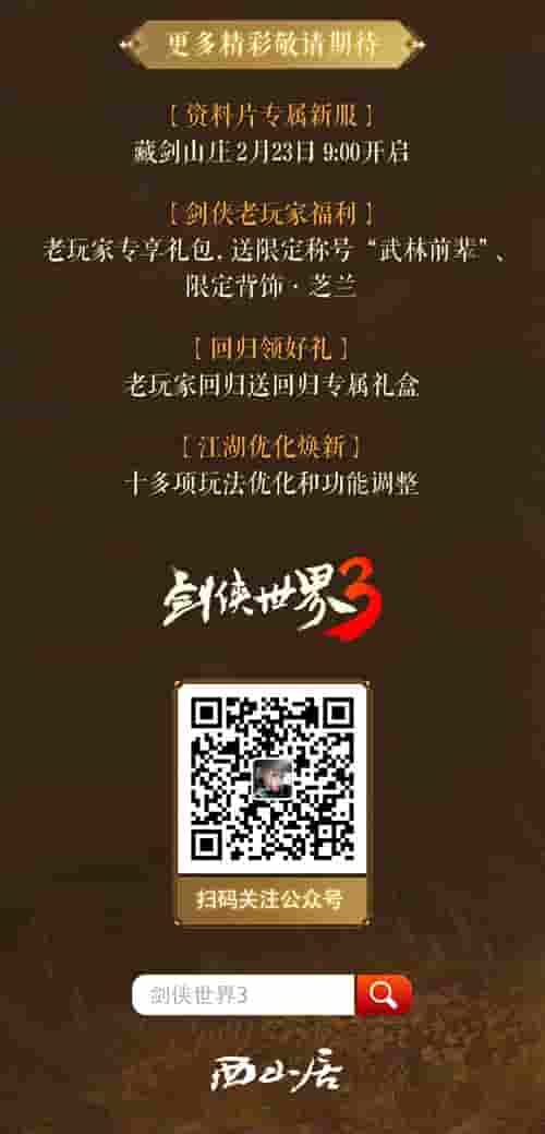 西山居新一代剑侠情缘手游《剑侠世界3》资料片“藏剑山庄”2月23日全平台上线,新门派、新玩法、新地图、新剧情即将登场,海量内容令人目不暇接!《剑侠世界3》“藏剑山庄”与你相约剑侠江湖,2月23日我们不见不散!