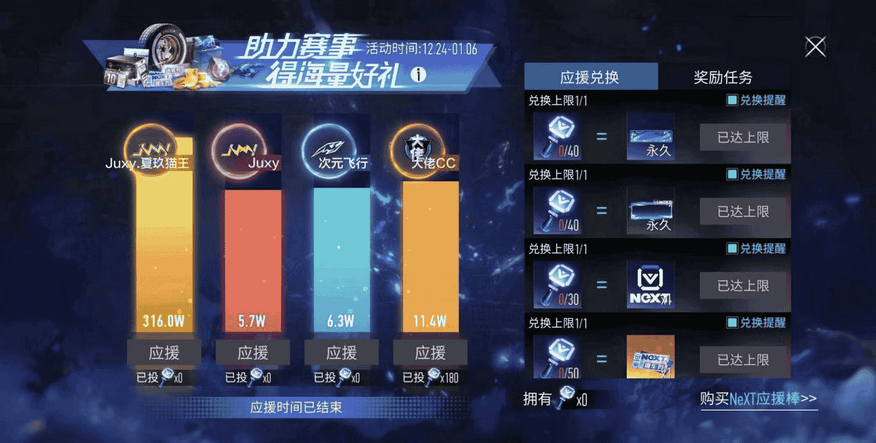 《王牌竞速》全国年度总决赛将在本次NeXT冬季赛中开启,上演最高层级赛事中的巅峰对决。本次的全国年度总决赛,【Juxy.夏玖猫王】【Juxy】【次元飞行】【大佬CC】四支实力强劲的队伍将在最高赛场上进行对决。在他们之中,有像三连冠【Juxy】、S4车神杯冠军【大佬CC】这样的逐冠热门,也有一次次追逐梦想决不放弃的熟悉车队。值得一提的是,本届赛事与游戏内的玩法进行了深度联动,玩家可在《王牌竞速》手游中挥起NeXT应援棒为支持的车队应援,选手们在赛道上疾驰,粉丝们在游戏中呐喊助威,共同奔赴热爱!!