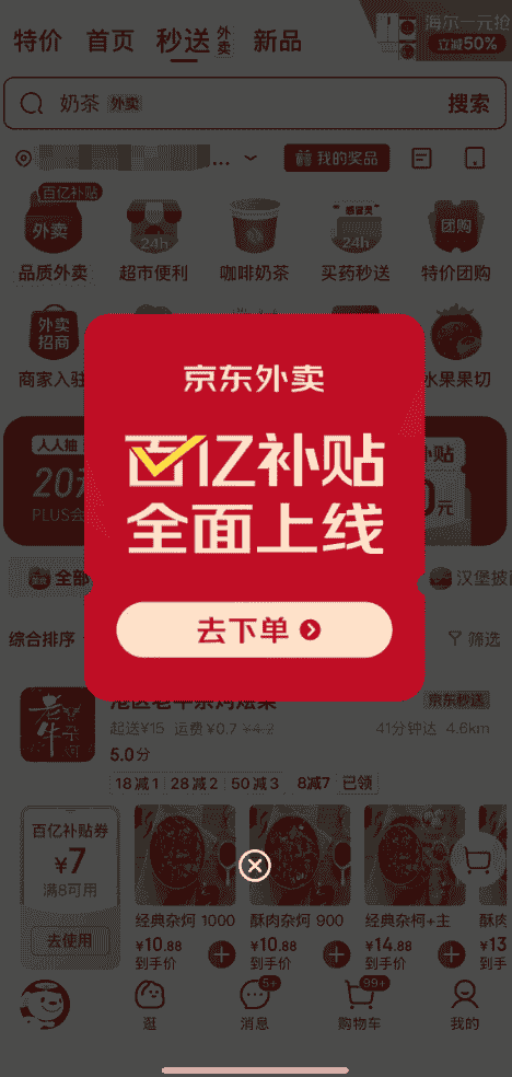 用户只需打开京东App,进入“秒送”专区,即可看到“京东外卖百亿补贴全面上线”的醒目弹窗。这一活动不仅覆盖了京东外卖平台上的所有餐饮门店,如麦当劳、海底捞、汉堡王等知名连锁品牌,还包括霸王茶姬、奈雪的茶等热门茶饮店。