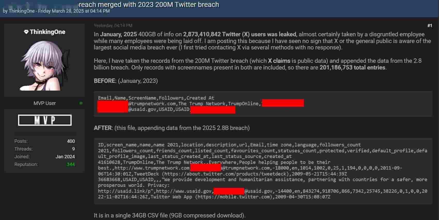近期,国际数据安全领域传来震撼消息,据知名安全资讯平台HACKREAD披露,数据泄露黑市Breach Forums上的资深用户ThinkingOne于本月28日爆料,指出知名社交平台X在今年1月遭遇了前所未有的数据泄露危机。此次泄露的数据量惊人,高达400GB,内含28亿7341万842条用户个人数据信息,远远超出了X平台官方公布的约3.357亿用户规模。