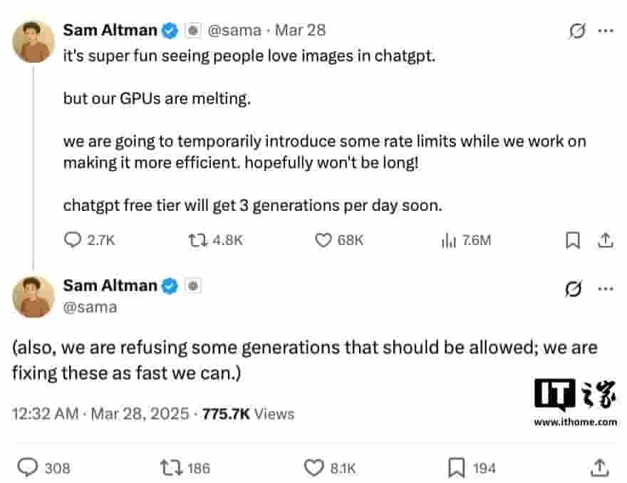 这一决定意味着,目前用户已经无法通过英文提示词直接在ChatGPT中生成吉卜力风格的图片。原本计划同时向ChatGPT的Plus、Pro、Team以及免费用户开放的GPT-4o图像生成功能也面临调整。由于需求过于旺盛,Sam Altman宣布免费版的上线时间将推迟,但具体何时推出尚未确定。