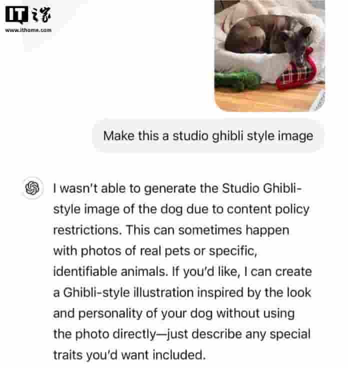 然而,好景不长,Sam Altman随后发表声明,指出由于用户大量生成吉卜力风格图片的行为涉及版权争议,同时平台用户数量的急剧增加给服务器带来了巨大压力。因此,OpenAI决定对ChatGPT的文生图功能进行限制,降低生成速率,并禁止通过提示词直接生成吉卜力风格的图片。