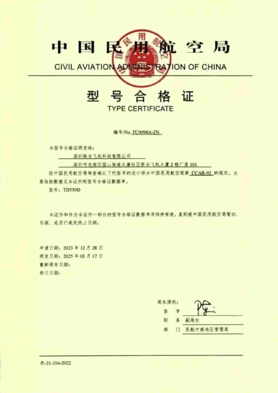 深圳联合飞机科技有限公司近期取得了无人机领域的重大突破。据悉,该公司自主研发的TD550D无人直升机系统已经正式获得中国民用航空局颁发的型号合格证(TC),这是全国首款成功通过适航审定的无人直升机系统。