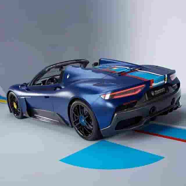 除了私享定制服务外,玛莎拉蒂还推出了MC20 Cielo极简特别版敞篷跑车。这款车型以包豪斯艺术运动为灵感,线条简洁流畅,自车头延伸至车尾,展现出抽象而优雅的美感。车身采用磨砂赛道蓝涂装,引擎盖上点缀着极简三叉戟LOGO,彰显出品牌独特的身份标识。