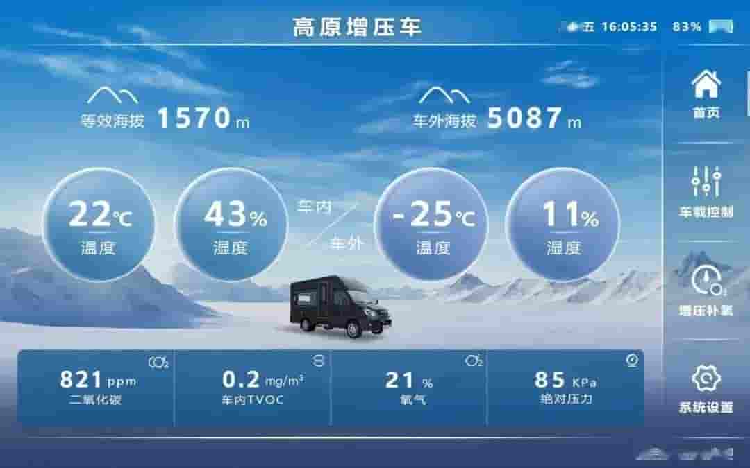 这款增压车采用了自主研发的智能增压技术,该技术能够根据海拔高度的变化自动调节车内压力,确保行车过程中舱内气压维持在平原水平。这一创新设计有效缓解了乘客在高原地区常见的头痛、呼吸困难等高原反应症状,为乘客提供了更为舒适的乘坐体验。