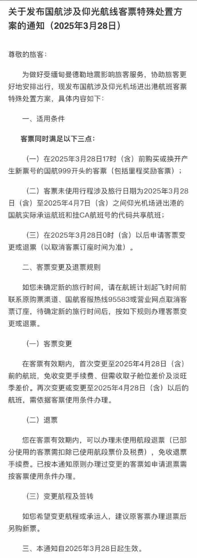 紧接着,中国国际航空也发布了官方公告,同样为涉及缅甸航线的乘客提供了全面的退改签服务。公告内容详尽,涵盖了乘客可能遇到的各种情况与解决方案。