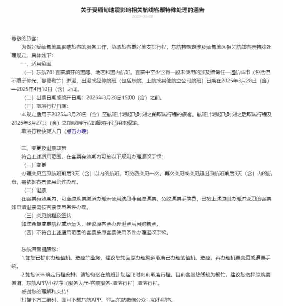 中国东方航空同样不甘落后,迅速响应,发布了针对缅甸地震的航线客票特殊处理措施。公告中明确指出,将全力保障乘客的权益,确保每位乘客都能顺利办理退改签手续。